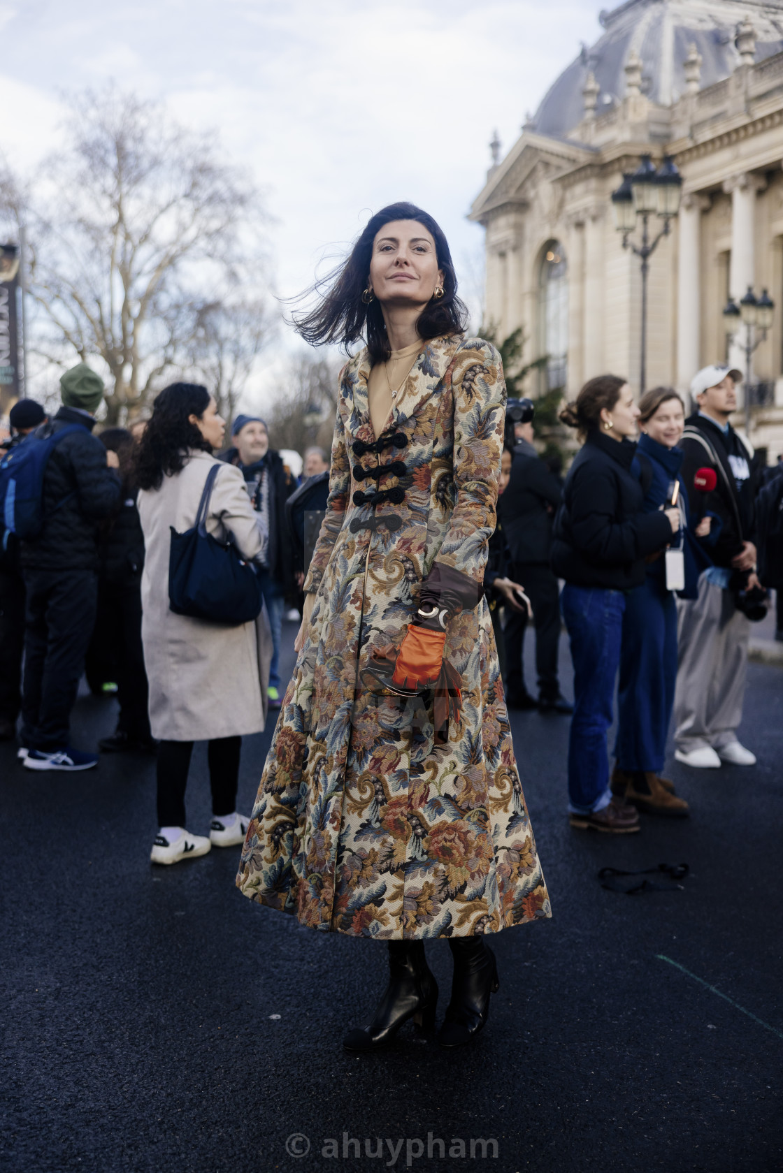 Giovanna Battaglia Engelbert at the entrance of Schiaparelli show during Paris Haute Couture Fashion Week Spring/Summer 2025 - 2026