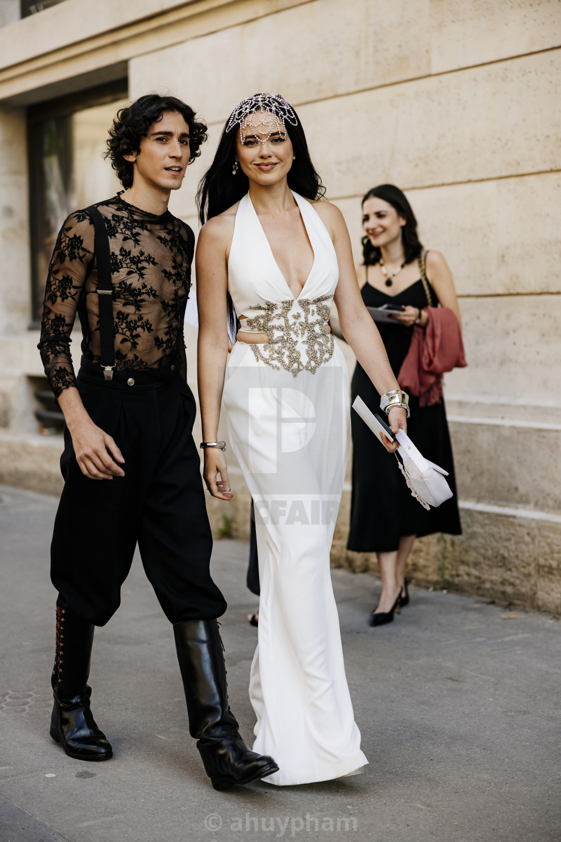 Kristina Bazan & Matteo Pozzi at the entrance of Zuhair Murad show during Paris Haute Couture Fashion Week Fall/Winter 2025 - 2026.